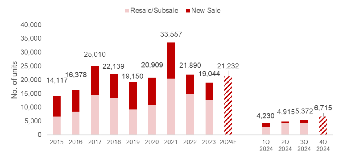 In the secondary market, some 3,313 resale and sub-sale units were transacted in 4Q 2024 compared to 4,212 in 3Q 2024. For the whole of 2024, 14,781 resale and sub-sale units were transacted compared to 12,623 units in 2023.