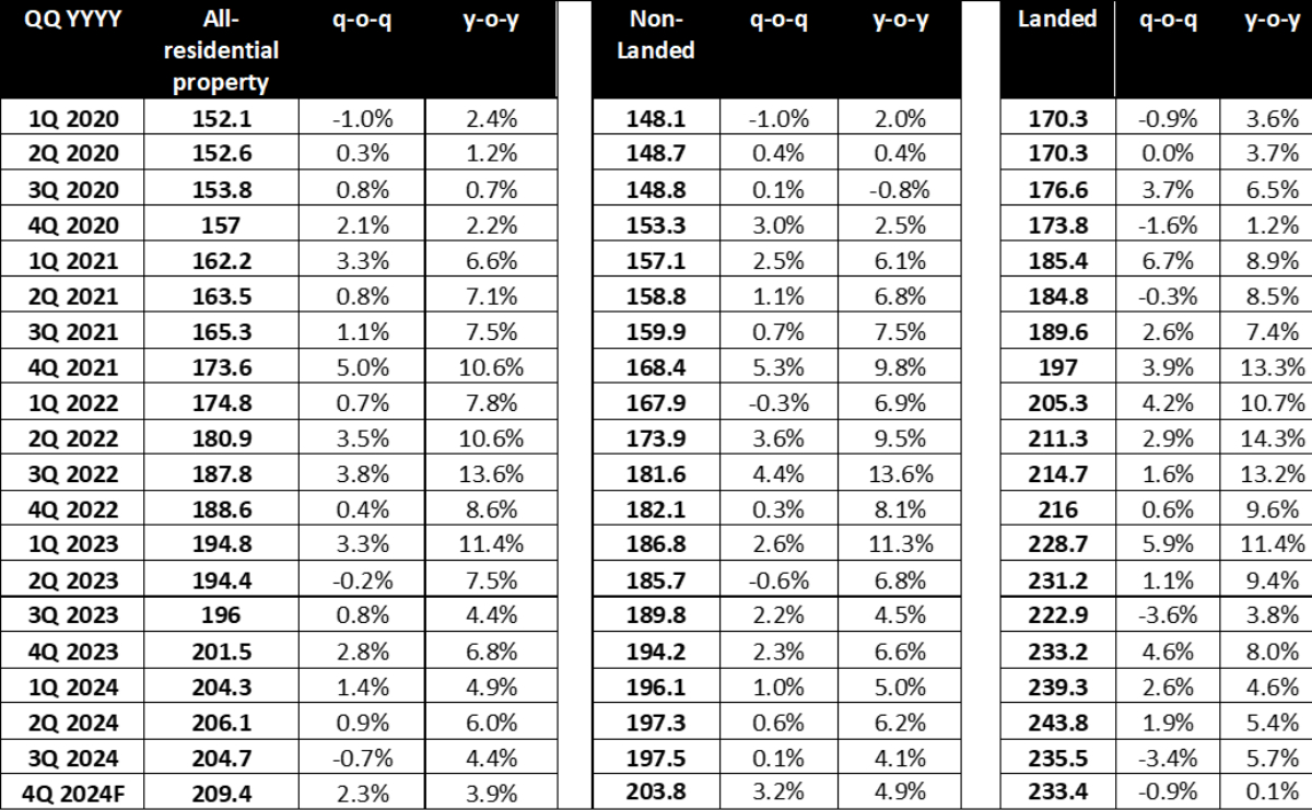 SINGAPORE, 02 January 2025 – According to URA flash estimates, the all-residential property price index registered a faster pace of growth of 2.3% quarter-on-quarter (q-o-q) in 4Q 2024, reversing the 0.7% q-o-q decline in 3Q 2024. For the whole of 2024, the all-residential property price index rose at a slower pace of 3.9% y-o-y, compared to 6.8% y-o-y growth in 2023 and 8.6% in 2022.