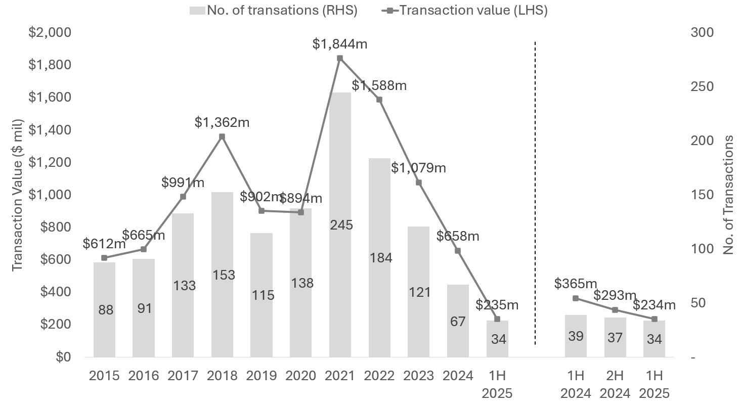 The landed shophouse market further weakened in 1H 2025, with only 34 transactions amounting to $234.7 million. This is a decline from 37 transactions worth $292.6 million in 2H 2024, and it represents the lowest number of transactions in a half-yearly period since 2H 1998, when just 31 units were transacted. Against the peak in 2021, when 245 landed shophouses worth a total of $1.8 billion were sold, the market appears to be slowing down.