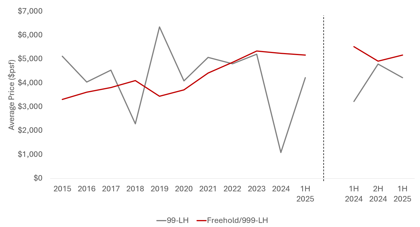 The market demonstrates a divergence based on tenure. Of the 34 landed shophouses transacted in 1H 2025, 91% (31 units) were of Freehold (FH) tenure, including shophouses with 999-year leasehold (999-LH) tenure. Comparing 2H 2024 and 1H 2025, the average psf price of freehold landed shophouses increased by 5.3% to $5,168. This is because these owners are not compelled to lower prices. Being immune to lease decay, freehold shophouses can withstand market volatility, maintaining their value over the long term. Institutional investors view this as an asset worth holding in their portfolio. In contrast, their 99-year leasehold counterparts experienced a 12% decrease in prices, as buyers may have concerns about the remaining lease term.