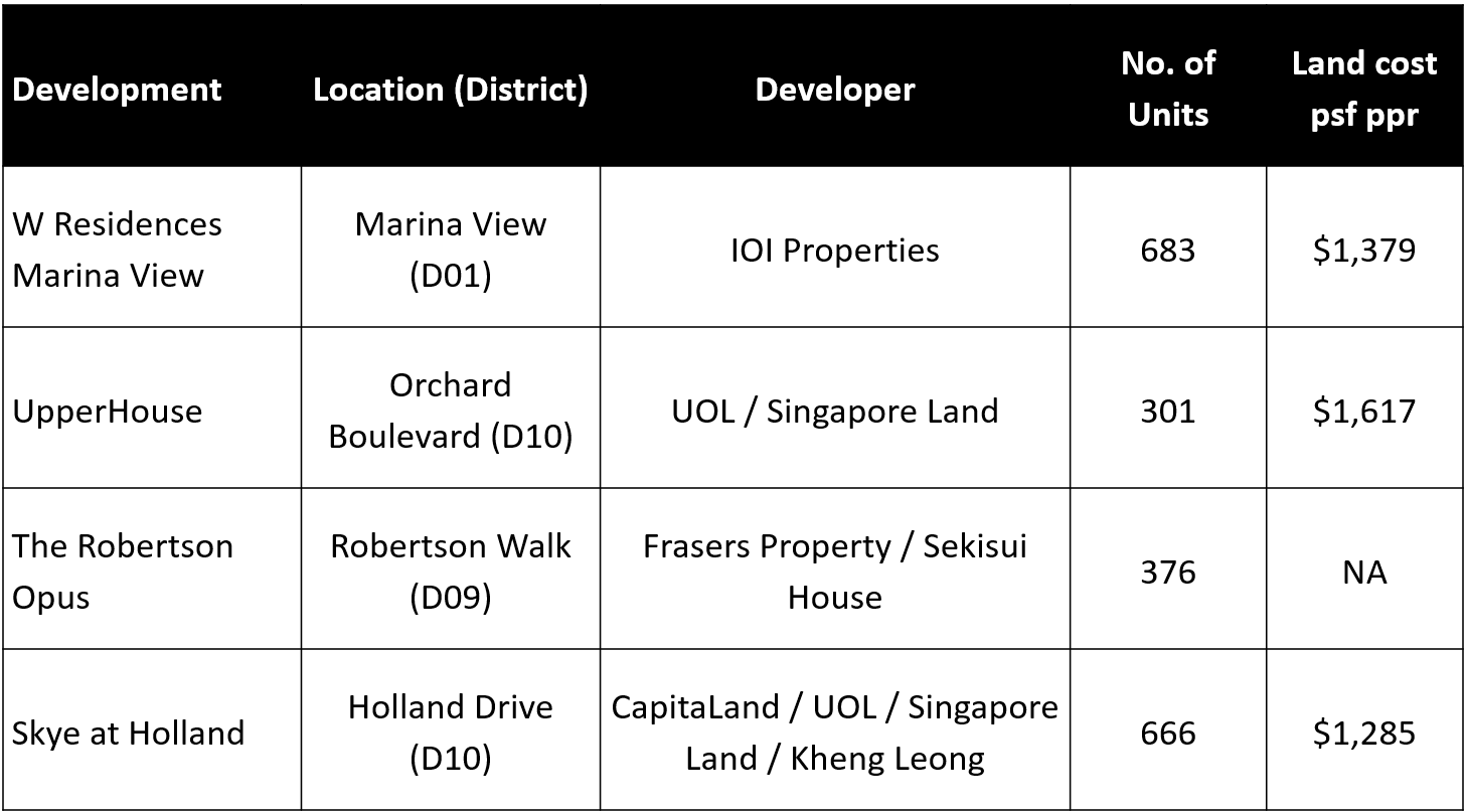 Apart from The Robertson Opus, which holds a 999-year leasehold tenure, the other developments are on 99-year leaseholds. Nonetheless, the larger units in these developments could be priced upwards of $5 million. W Residences Marina View, a branded residence, could have units priced above $10 million.
