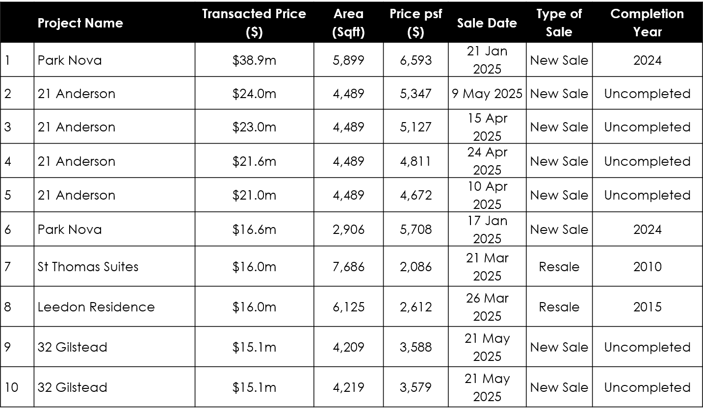 In January 2025, a 5,899 sq ft unit at Park Nova was transacted for $38.9 million, translating to $6,593 per square foot (psf). This marks the second-highest unit price achieved to date, trailing only the sale of a 3,089 sq ft unit at The Marq on Paterson Hill, which fetched $20.5 million ($6,650 psf).