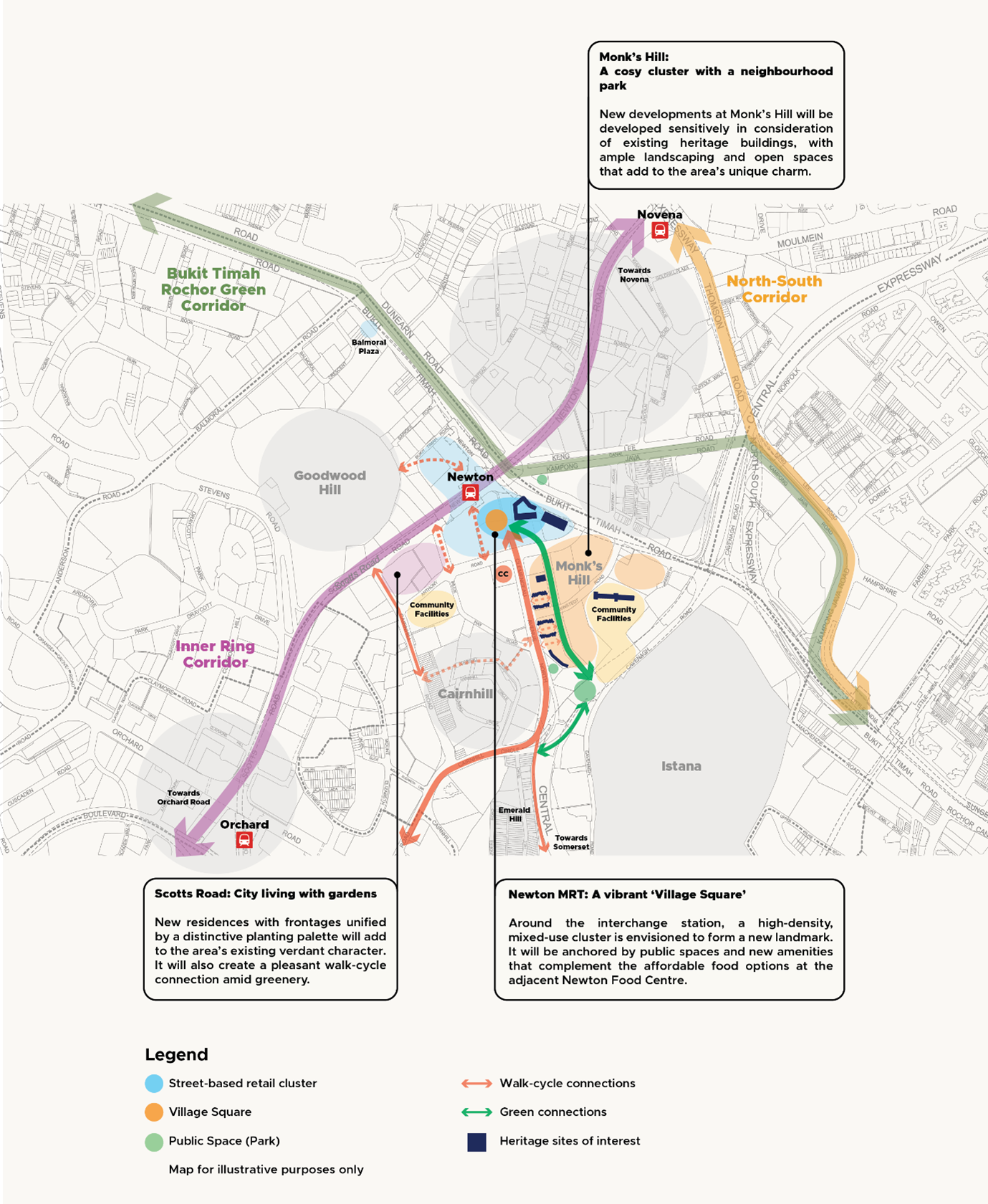 As part of the 2025 Draft Master plan, we can expect around 5,000 new private homes in three developmental clusters, namely around Newton Circus, Scotts Road, and Monk’s Hill.