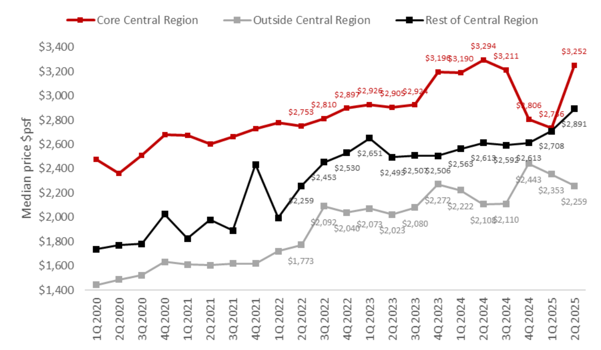 Among the market segments, non-landed homes in the Core Central Region (CCR) recorded the fastest pace of growth at 3.0% q-o-q in Q2 2025, followed by the Outside Central Region (OCR) with a 1.1% increase. Conversely, the Rest of Central Region (RCR) saw a reversal, registering a 1.1% q-o-q decline. Non-landed home prices held firm, underpinned by new home sales in the CCR and OCR that set fresh pricing benchmarks.