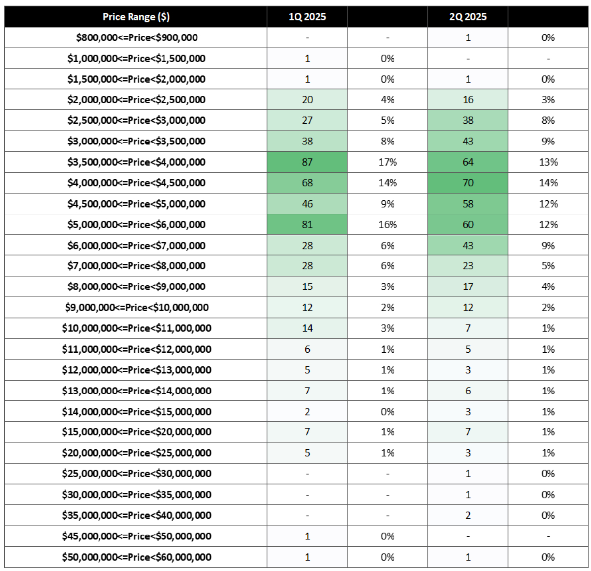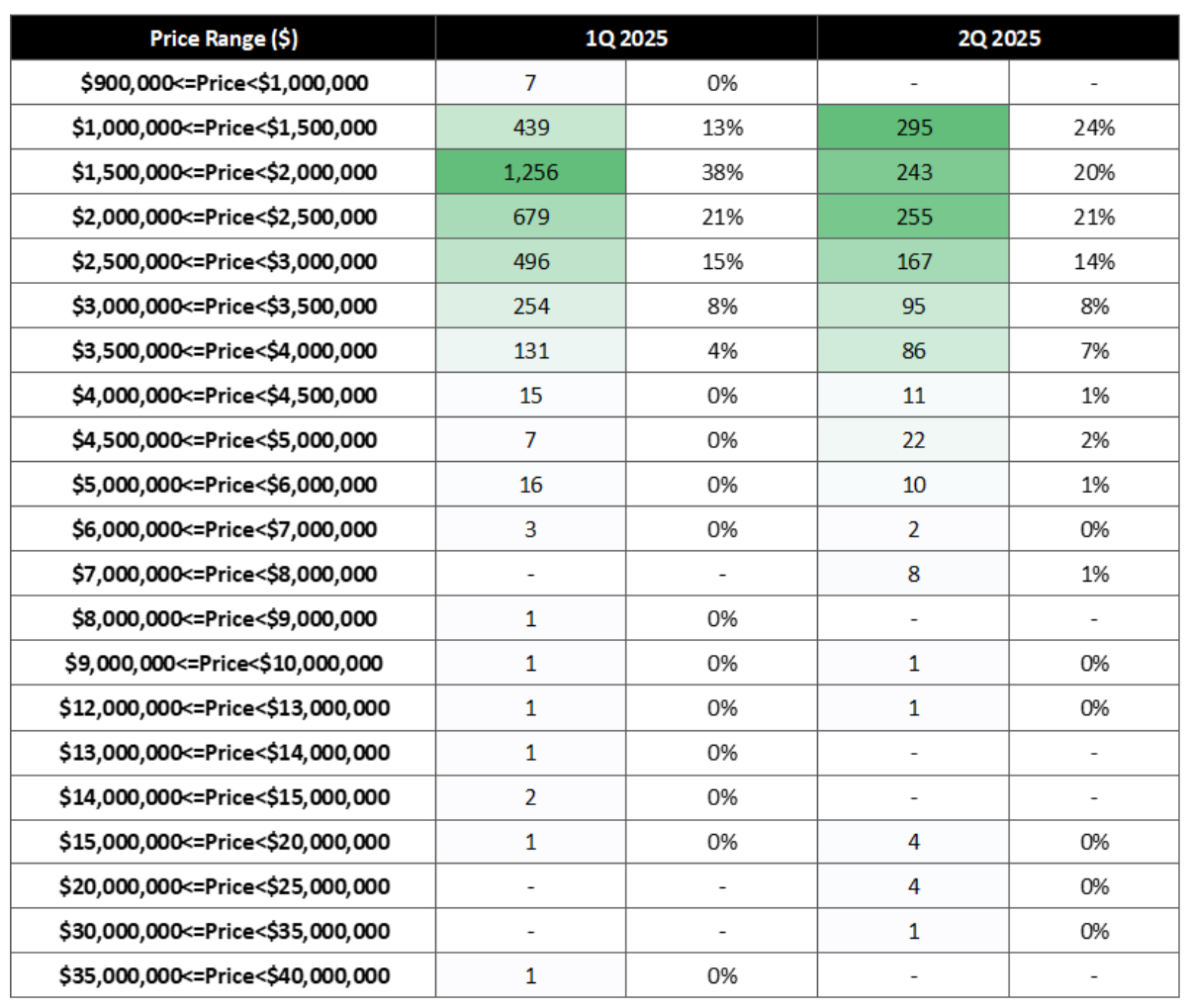 In terms of price quantum, 2Q saw a more even distribution of transactions across the $1 million to $2.5 million range (Table 2), compared to 1Q, where a heavier, larger proportion of sales weight in the $1.5 million to $2 million bracket.”