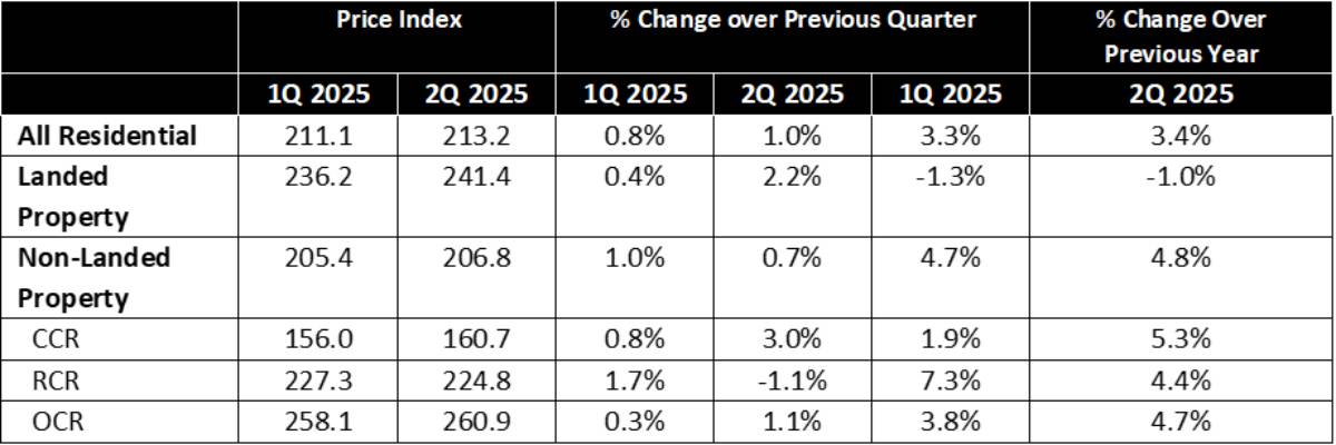 “The All Residential Private Price Index rose 1.0% quarter-on-quarter (q-o-q) in 2Q 2025, extending from the more moderate growth of 0.8% seen in 1Q 2025. On a year-on-year (y-o-y) basis, the All Residential Private Price Index rose 3.4%.