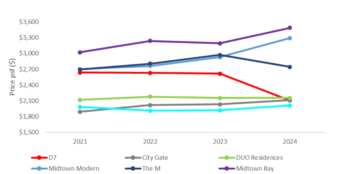 Price growth for past mixed-use developments in District 7 has remained positive from 2021 to 2024. Median unit prices (on a dollar per square foot basis) for these developments have annualised growth rates of between 0.5% to 6.8% across a holding period of three years; this surpasses the performance in District 7, where prices have trended downward over the same timeframe.