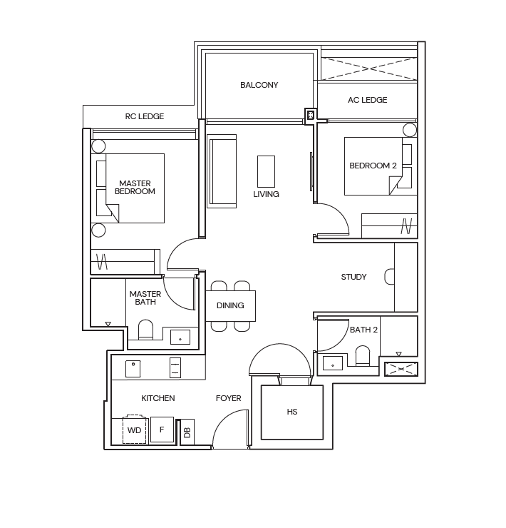 Built in a “dumbbell” layout, the two-bedroom + study layout offers an open kitchen concept, which may help eliminate underused space within the house. The study is placed in a corner that opens to the living and dining area, offering some privacy. Similarly, the bedrooms are placed at opposite sides of the apartment which offer privacy to the occupants of each room. The apartments in this particular type of units (B3) also have a balcony, which other two-bedders in the development do not have.