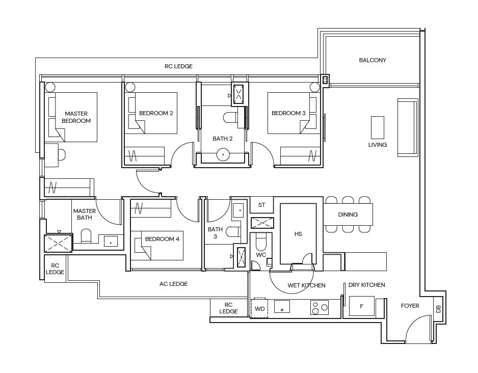 One other special thing about the four and five room units in Terra Hill is that they have both a dry and wet kitchen, which can help to keep the place organised. Unlike the two- and three-room apartments, the four-bedroom apartments are built in a “corridor” layout, where all the rooms are connected through a common corridor. The bedrooms are placed together at a corner of the apartment, with bathrooms nearer to the bedrooms to increase convenience to the occupants of the room.