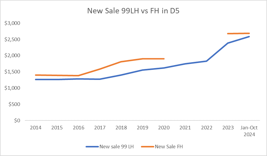 Chart 1: New Sale Leasehold (99 LH) vs Freehold Properties in District 5 (D5)