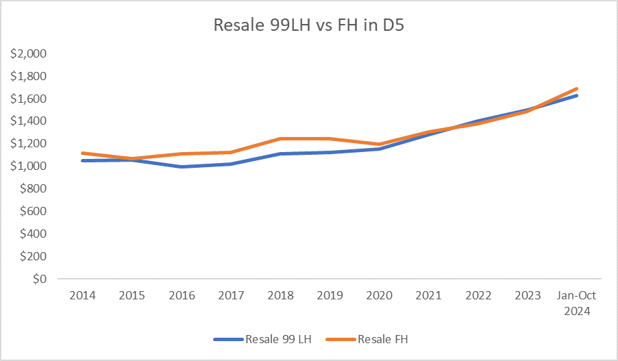 And this is not only seen for new sale properties, but also resale properties in D5. Although the average price of a resale freehold property is still more expensive compared to a leasehold property, it is more valuable to buy the freehold property since the prices are very similar, yet the tenures drastically differ.