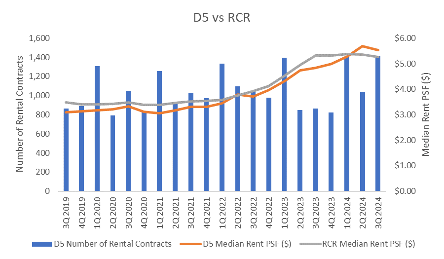 Consisting predominantly of three-room apartments, Terra Hill’s target audience may likely be investors, young couples or retirees looking to right size from a bigger house. For those who wish to rent instead of buy, rental rates in D5 are comparable with the RCR, with the number of rental contracts in D5 seeing a general increase in the last five years. Expats who work in the city or in key nodes should definitely consider renting Terra Hill, given the comparable rates.