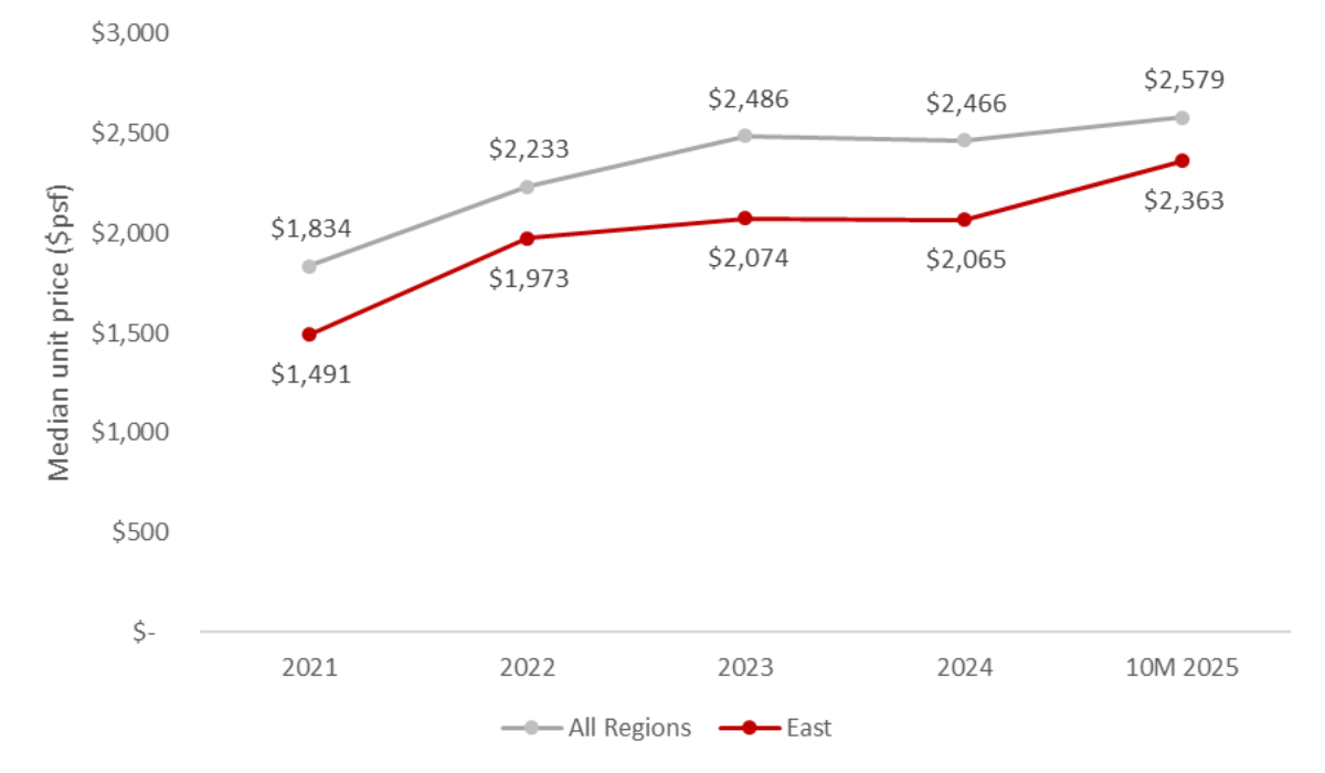 A similar trend can also be found in the private home segment in the East, where new home prices have risen in tandem with nationwide gains. Between 2021 and 10M 2025, median unit prices of new east-side homes climbed 40.6%, from $1,491 psf to $2,363 psf. This movement broadly mirrors the 58.5% increase in median unit prices of non-landed private homes across Singapore, which rose from $1,834 psf in 2021 to $2,579 psf in 10M 2025.