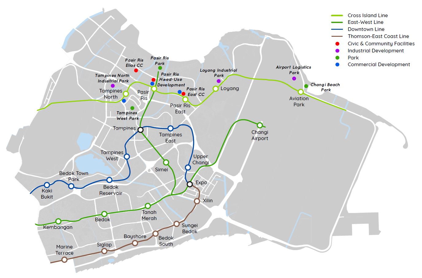 East-side residents will also benefit from enhanced transport connectivity with the new Cross Island Line (CRL), as well as and Thomson-East Coast Line extensions. By 2030, the first phase of the CRL will be completed, featuring 12 stations stretching from Bright Hill to Aviation Park. Key stops in the East, such as Tampines North and Pasir Ris, will also bring improved transport connectivity to their respective residential areas, especially with the latter being slated to become an interchange between the CRL and the East-West Line.