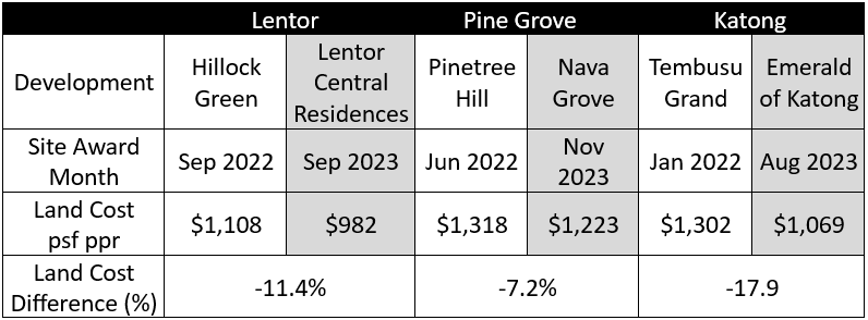 In addition, with a reduced site efficiency, developers have thus adjusted their land bids downwards too as they have less sellable area. Using the same three case studies, we found that land costs have decreased across various areas with adjacent sites launching pre- and post-harmonisation of floor area.