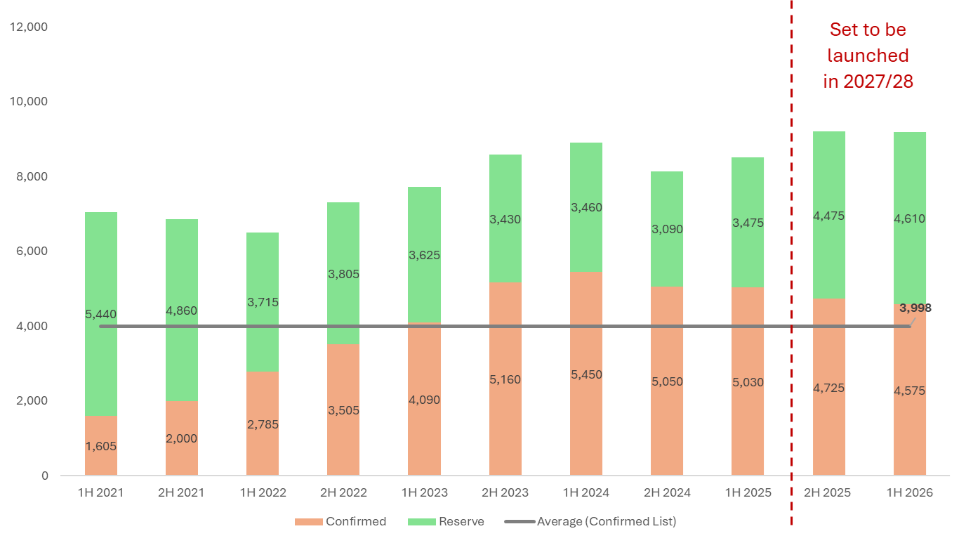 Since the first half of 2021, the number of units on the Confirmed List has generally increased. From the first half of 2023 onwards, this number has also surpassed the half-yearly average of 3,998 units recorded since the first half of 2021. Therefore, beyond 2026, there is a strong pipeline of new homes expected to be completed in 2027 and 2028.