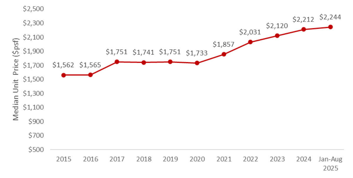 From 2015 up till August 2025, median unit prices for resale non-landed private properties in District 10 have increased overall by 43.7%, rising from $1,562 psf to $2,244 psf. This results in a modest yet steady annual growth rate of about 3.3% across this period.