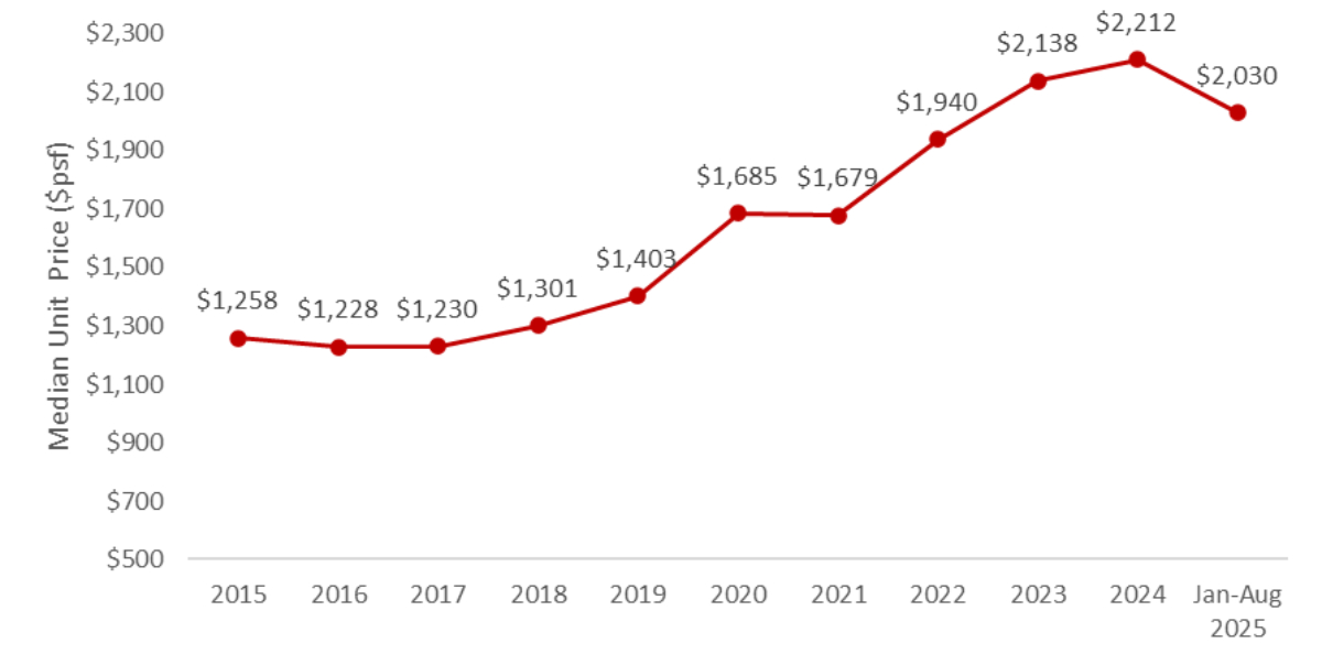 Such growth is also reflected in the Queenstown planning area, which Holland Village is a part of. Between 2015 up to August 2025, median unit prices there rose sharply by 78.2%, from $1,258 psf to $2,030 psf; this translates into an annualised growth rate of approximately 4.4%.
