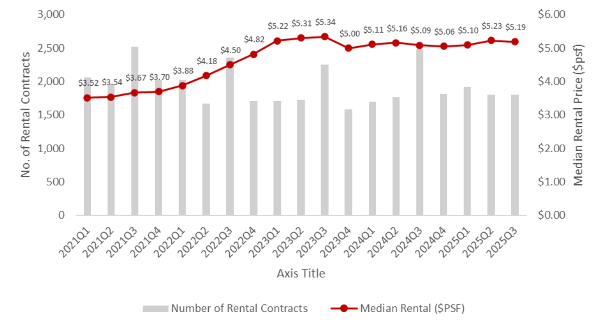 Similarly, within the rental segment, non-landed private homes in District 10 have seen steady growth. Since 2021, median rents have climbed 47.4%, from $3.52 psf to $5.19 psf. At the same time, rental volumes have held relatively stable, with between 1,700 and 2,500 contracts signed each quarter.