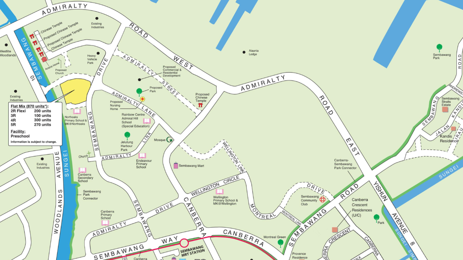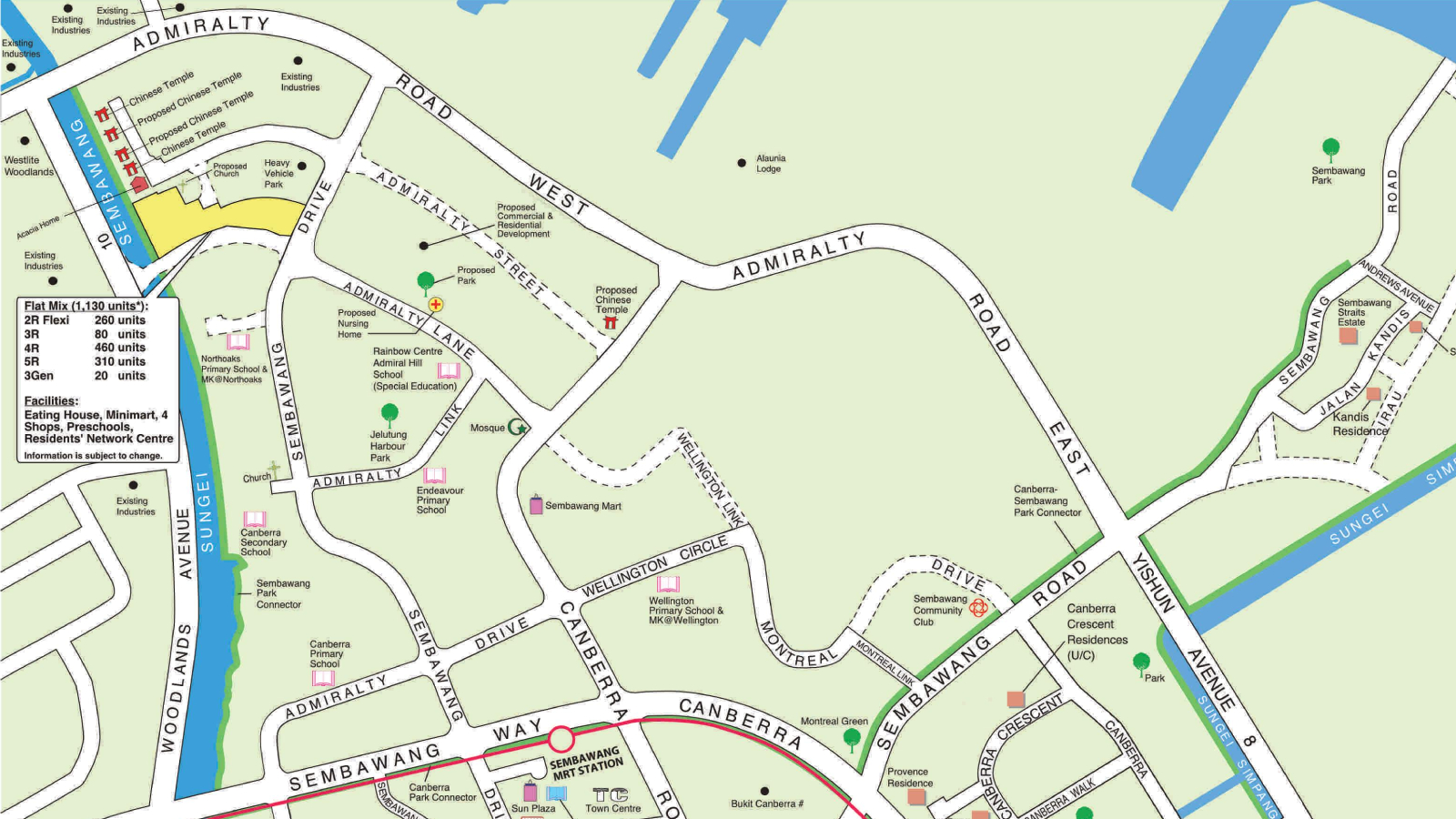 Both projects are located some distance from the nearest MRT station, with Sembawang MRT Station being a 20-minute bus ride away. However, they could appeal to families with young children, as Northoaks Primary School, Endeavour Primary School, and Canberra Secondary School are all within 1 km.