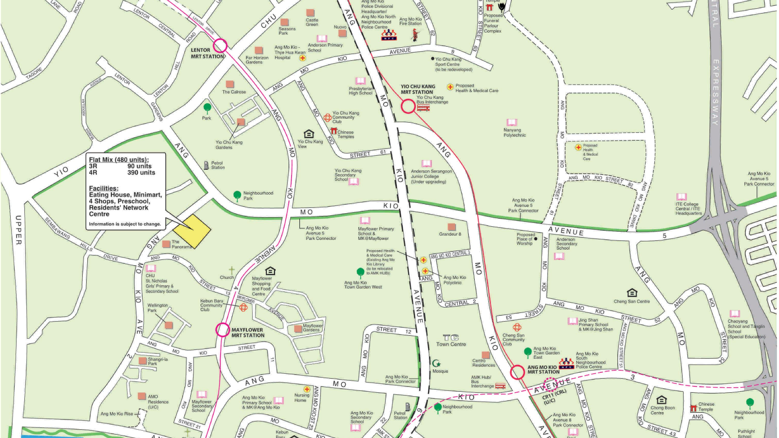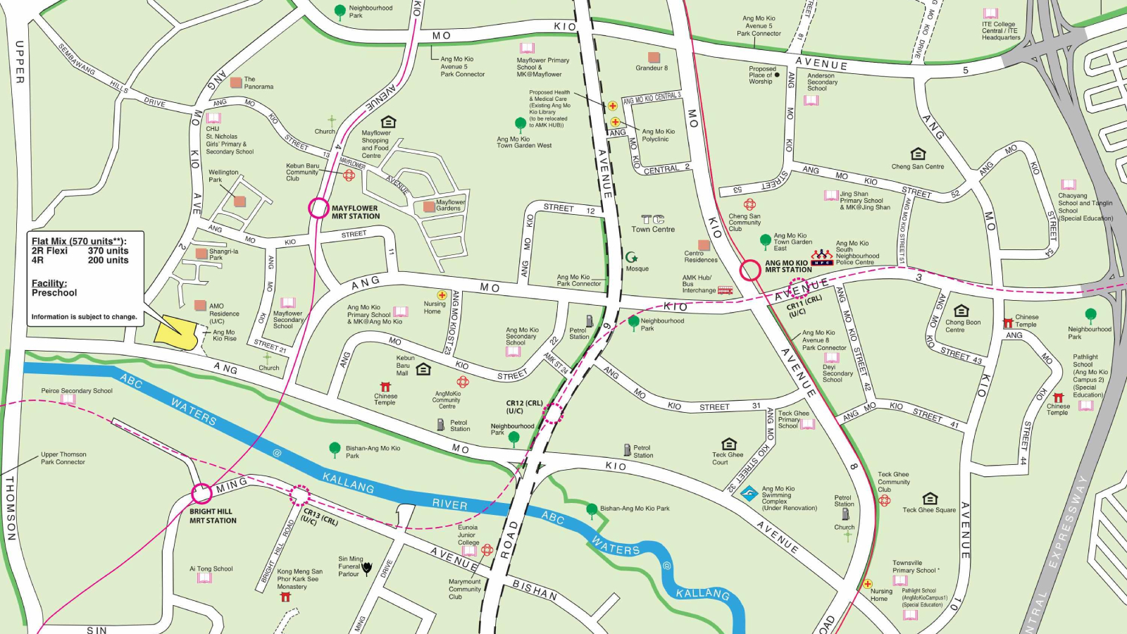 The Ang Mo Kio (Avenue 1) project is the larger of the two, comprising 2-room Flexi (370 units) and 4-room (200 units). Notable educational institutions nearby include Ang Mo Kio Primary School and Mayflower Secondary School.