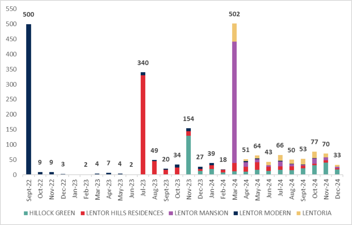 Barring exceptions, such as months coinciding with new project debuts or seasonal slowdowns, sales of new private homes in Lentor have maintained a steady rhythm.