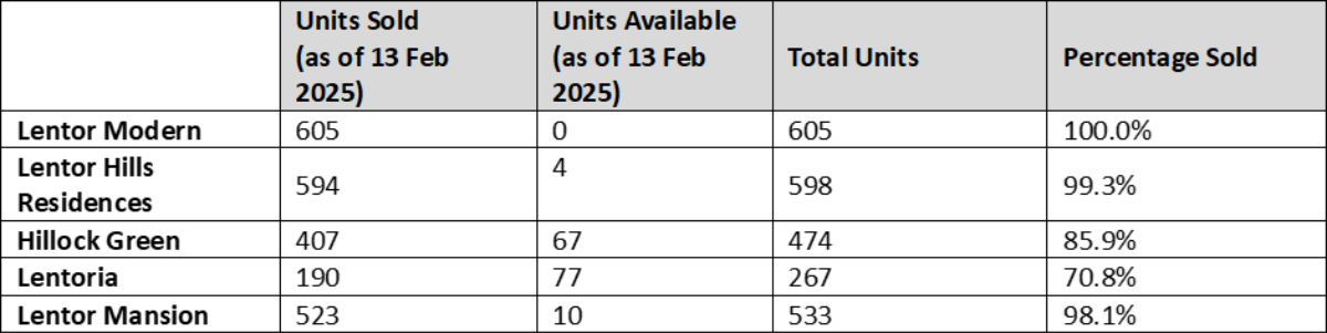 Meanwhile, despite slower initial sales, both Hillock Green and Lentoria have made significant strides in their sales progress, with 85.9% and 70.8% of their units respectively sold as of 13 February 2025.
