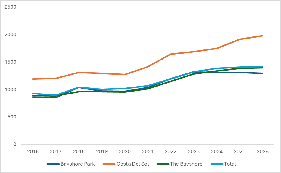 Based on the past decade of transactions of private homes in the area, we can observe a strong upward trend in the price growth of the three ageing condominiums in Bayshore.