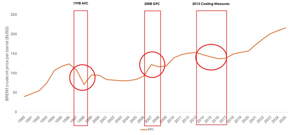 Aside from geopolitical crises, Singapore’s property market has also experienced several notable episodes that resulted in measurable declines in the PPI. These include the Asian Financial Crisis of 1998, the Global Financial Crisis of 2008, and the implementation of market cooling measures in 2013.