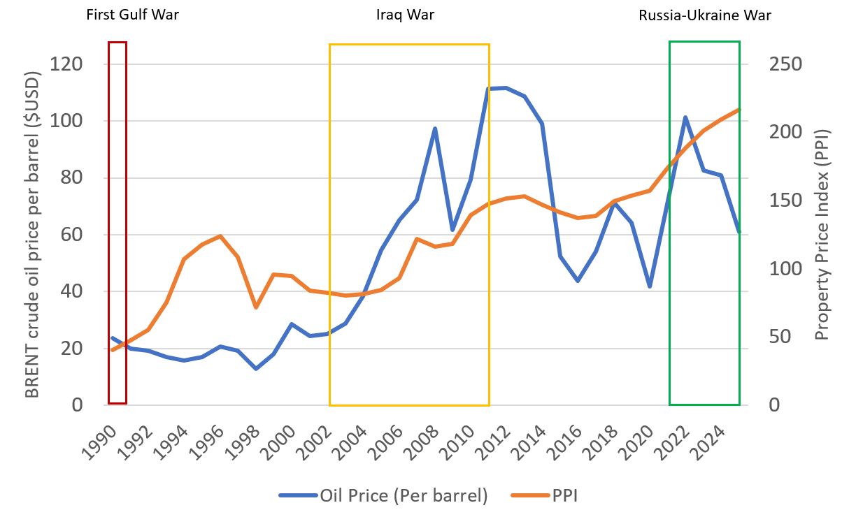 For instance, during the first Gulf War (1990-1991), the PPI maintained its growth throughout the conflict and rose by roughly 160% over the following five years, before peaking in 1996. Subsequently, during the Iraq War (2003–2011), the PPI rose by around 82.9% throughout the conflict. Similarly, an upward trend in private property prices has been observed since the outbreak of the Russia–Ukraine conflict in 2022.