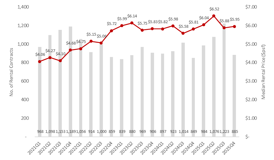From the start of 2021 to the end of 2025, the median rent for non-landed private properties (excluding Executive Condominiums) in River Valley rose by 46.6%, from $4.06 psf to $5.95 psf, broadly mirroring the wider uptrend in rents across the Core Central Region (CCR). At the same time, annual rental volumes have remained stable at around 3,500 to 4,400 contracts from 2021 to 2025, suggesting that demand in River Valley has held firm even as asking rents have risen.