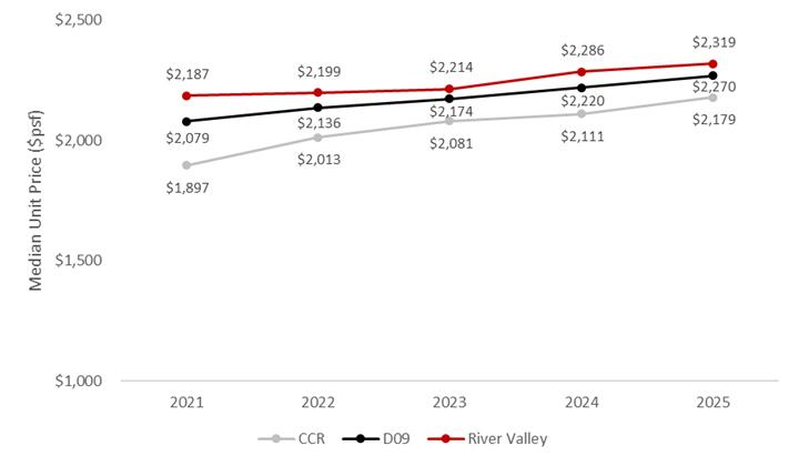 Non-landed private residences in River Valley have also recorded steady price appreciation in recent years. From 2021 to 2025, median resale prices in the precinct rose by 6.0%, from $2,187 psf to $2,319 psf. While this pace of growth is slower than that of non-landed private homes in the wider District 9 and CCR sub-markets, resale prices in River Valley have continued to command a premium over regional counterparts. These higher resale prices reflect River Valley’s status as a premium residential neighbourhood.