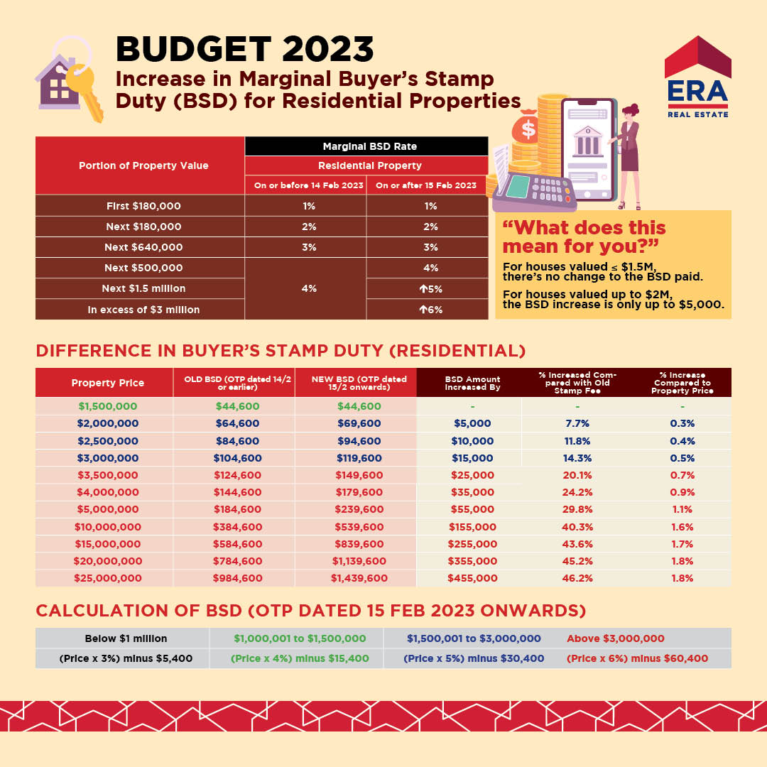 Before the Budget 2023 announcement, residential properties were taxed at a rate of 4% beyond $1M of their value, but that has since increased to 5% beyond $1.5M and 6% beyond $3M from 15 Feb 2023 onwards.