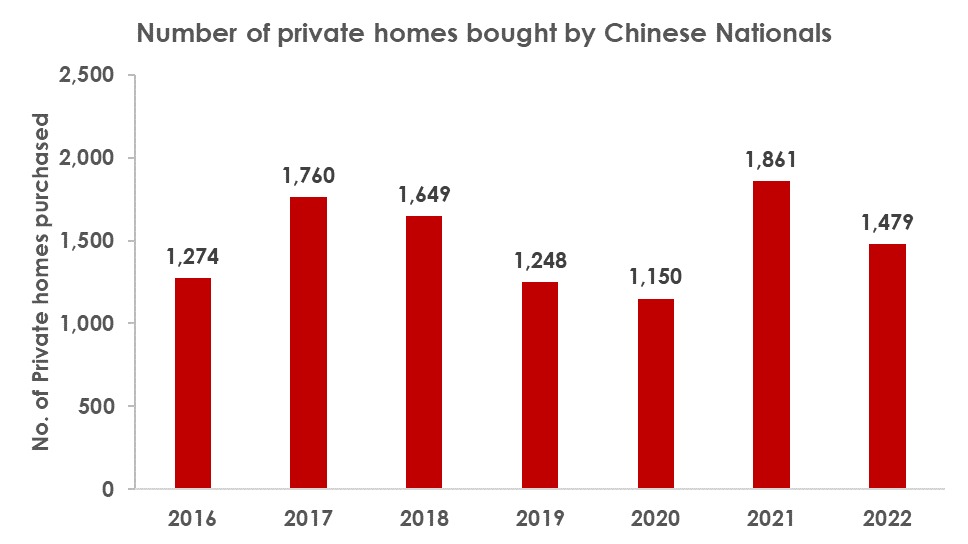 In 2022 alone, Chinese mainlanders bought 1,479 residential properties, more than 2019 and 2020, which saw 1,248 and 1,150 transactions respectively. It’s possible that we could see higher, or at the minimum, similar transaction numbers in 2023 as COVID-19 travel restrictions are loosened domestically and in China.