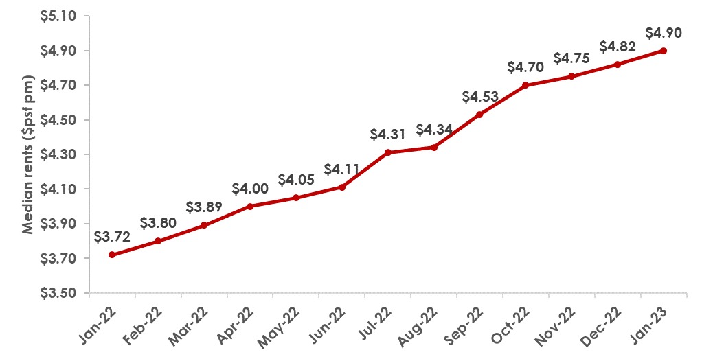 Nationwide data from the Urban Redevelopment Authority (URA) reflect a year-on-year hike in median PSF rental cost from $3.72 PSF to $4.90 PSF, which translates into a 31.7% increase.