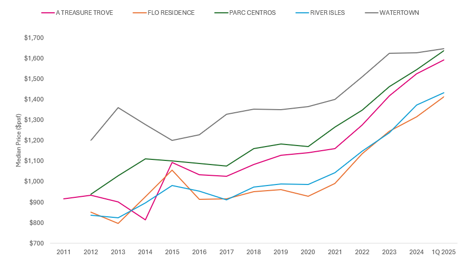 Since their respective debuts, condominiums in the Punggol have delivered a compound annualised returns of between 2.5% and 4.4%, based on median transacted price per square foot ($psf). Even though there are some price differences across the projects, their price trends have generally moved in parallel, reflecting a broadly similar pace of appreciation over time. This observation brings us to our next point.