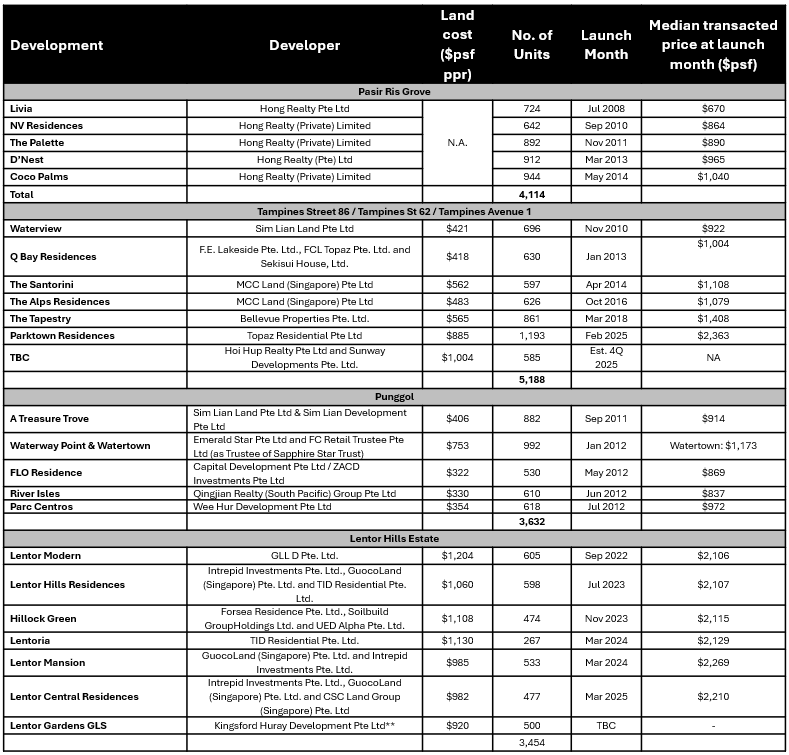 Between 2008 and 2014, Pasir Ris Grove saw five new homes launches bringing over 4,100 new homes in the vicinity. All five projects were also collectively developed by Hong Realty Pte Ltd. Likewise, between 2010 and 2017, five residential sites along Tampines Street 86 / Tampines Avenue 1 were awarded under the Government Land Sales (GLS) Programme to different developers. Altogether, these five sites yielded some 3,400 units. More recently, five sites, yielding approximately 3,600 units, were sold to drive the development of the Punggol New Town.