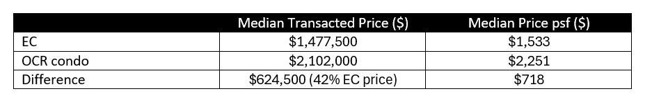 Table 1: Price comparison between a new EC and OCR condo (900 - 1,000sqft) in 2024