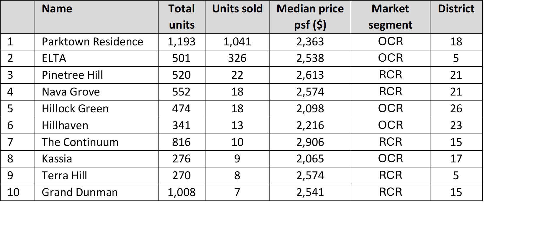 The third and fourth best sellers this month were Pinetree Hill and Nava Grove, neighbouring projects located at Pine Grove in the RCR District 21. These projects sold units of various sizes, from smaller 2-bedroom units to larger 4- and 5- bedroom units.