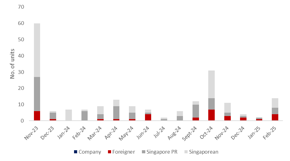With the punitive Additional Buyer’s Stamp Duty still in effect, foreigner demand for new private homes continued to stay flat. February 2025 saw a total of 11 transactions made by foreign buyers, making up just 0.7% of the month’s total deals. Meanwhile, Singapore Permanent Resident (PR) buyers clocked 110 transactions in February, making up 6.9% of all new private home (excluding ECs) purchases in the month.