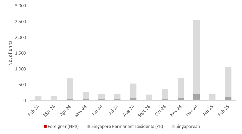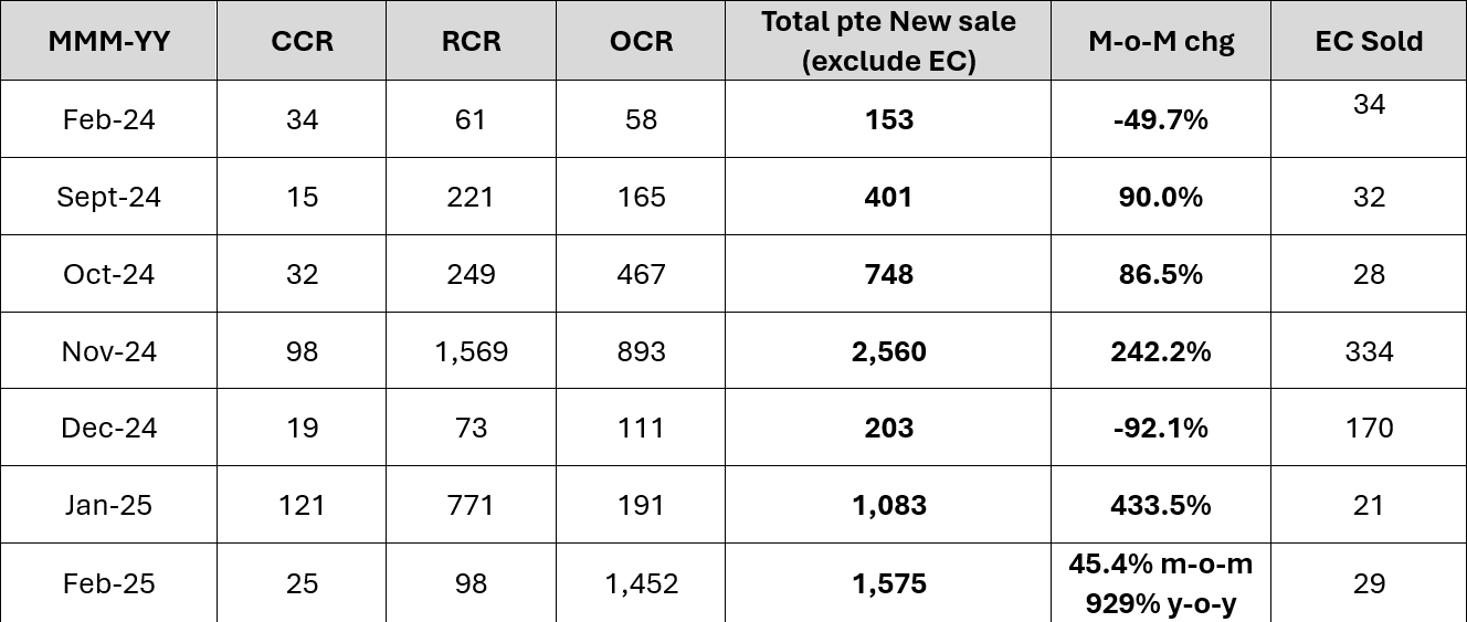In the month of February 2025, we witnessed 1,575 private new homes (excluding EC) sold in the month, this was a 45.4% increase month-on-month (m-o-m) following a promising opening to the year in January, which saw 1,083 private new homes transactions.