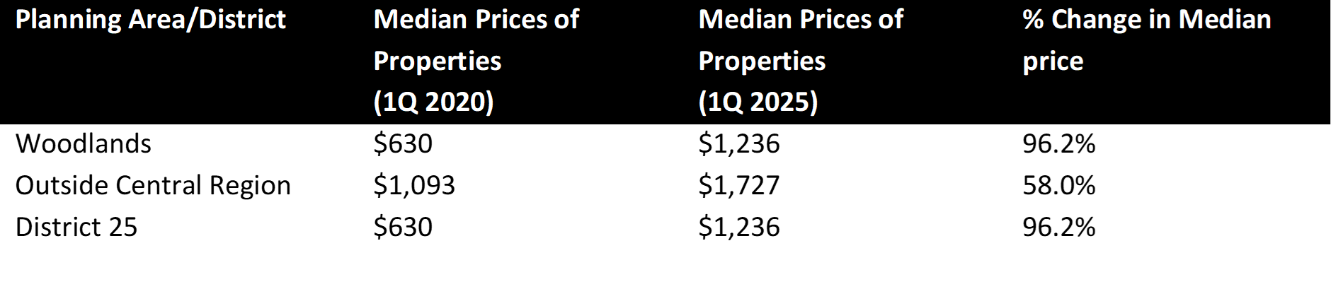Between 1Q 2020 and 1Q 2025, the median price psf of ECs in Woodlands, District 25, and OCR have increased across the board.