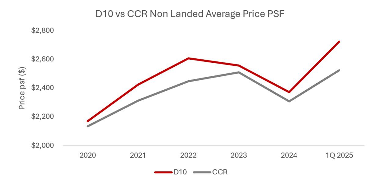Chart 1: Prices of non-landed homes in District 10 vs Core Central Region