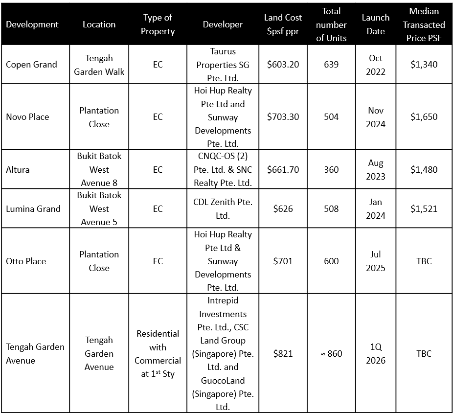 The first private condominium GLS site was awarded in January 2025 along Tengah Garden Avenue. The site was tendered at $821 per square foot per plot ratio (psf ppr) and can yield around 800 units. It is located conveniently next to the future Hong Kah MRT station. It is expected to launch in 2026 and be completed by 2030.