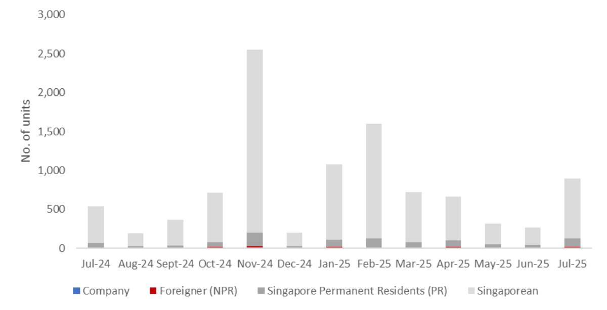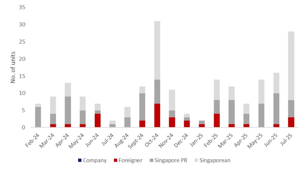 Lastly, Singaporeans continued to dominate the market in July, with new private home sales (excluding ECs) significantly increased by 235.8% quarter-on-quarter to 769 units, the highest since March 2025. This surge was mainly driven by two new launches in the CCR and pent-up demand in the region.