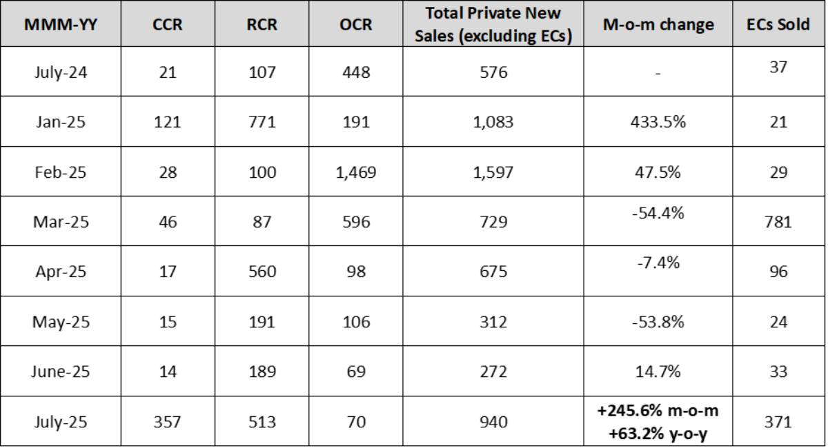 July 2025 saw developer sales coming in at 940 new private homes (excluding ECs), reflecting a consecutive 245.6% month-on-month (m-o-m) increase in transaction volume. The higher number of new home sales was largely driven by three new project launches in the month - namely Lyndenwoods, UPPERHOUSE at Orchard Boulevard and The Robertson Opus.