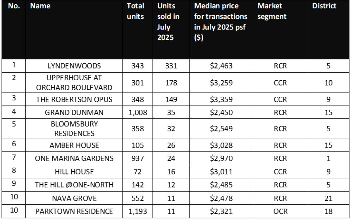 Rest of Central Region (RCR) projects made up the majority of the top-performing developments in July, with a total of 513 units sold. The Core Central Region (CCR) saw 357 units sold. Strong sales in the RCR were driven by first-time buyers and upgraders seeking city-fringe homes.