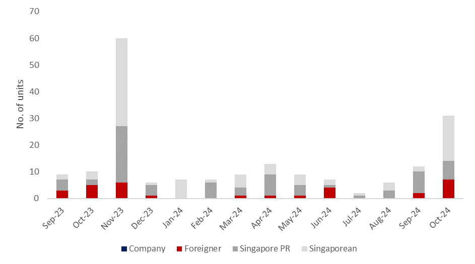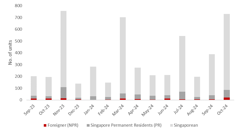 In total, October saw 738 new private homes sold, representing a 84.0% month-on-month (m-o-m) uptick over September’s performance (401 units sold). Year-on-year (y-o-y), new private home sales were also up 263.5% in October, compared to the 203 units sold over the same period in 2023.