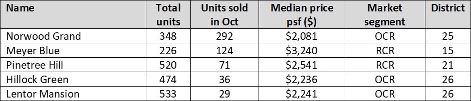 The top five best-performing projects in October were respectively Norwood Grand (292 units), Meyer Blue (124 units), Pinetree Hill (71 units), Hillock Green (36 units), and Lentor Mansion (29 units).
