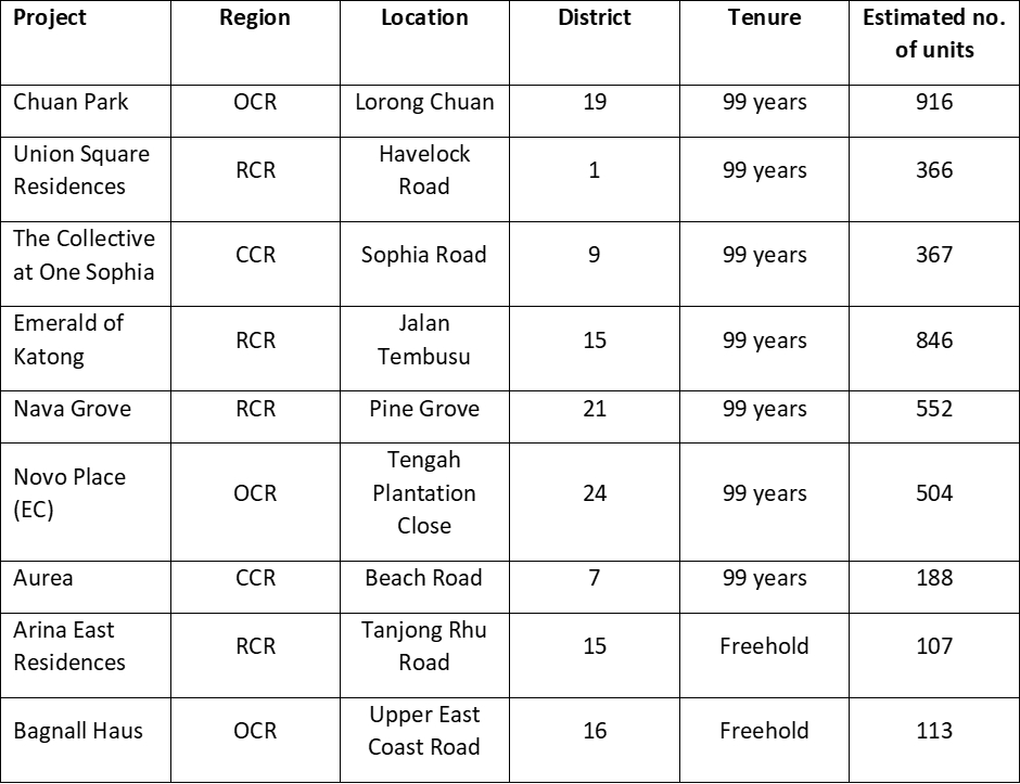 At present, there are at least 10 new private developments in the pipeline, potentially yielding more than 4,600 units in total. This includes several mega-developments in popular heartland areas such as Parktown Residence (1,195 units) in Tampines, Chuan Park (916 units) in Serangoon, Emerald of Katong (846 units) in the East Coast area.